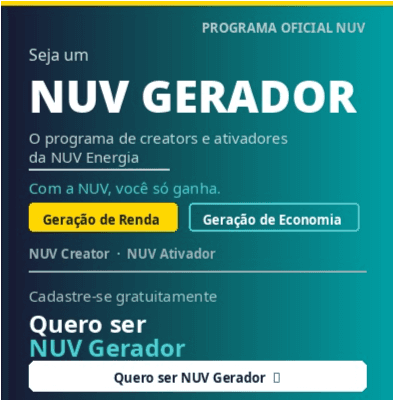 O NUV Gerador é o programa oficial da NUV Energia para creators e ativadores. Você gera renda indicando clientes. Seu indicado gera economia na conta de luz. Todo mundo ganha.