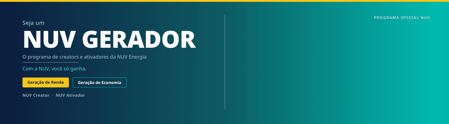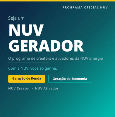 O NUV Gerador é o programa oficial da NUV Energia para creators e ativadores. Você gera renda indicando clientes. Seu indicado gera economia na conta de luz. Todo mundo ganha.