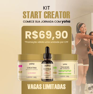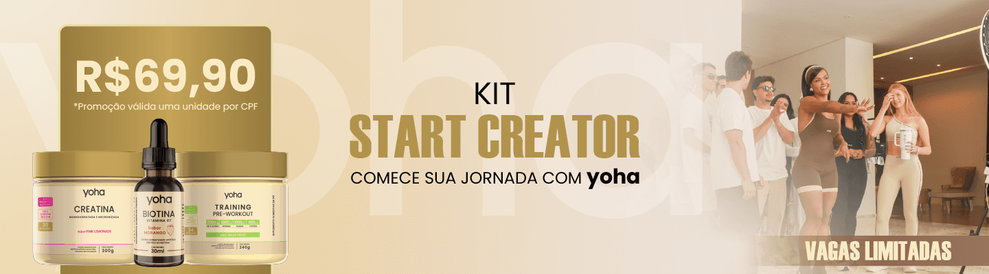 Por R$ 69,90 você recebe Creatina, Pré-treino e Biotina e ativa oficialmente sua jornada como Creator Yoha.